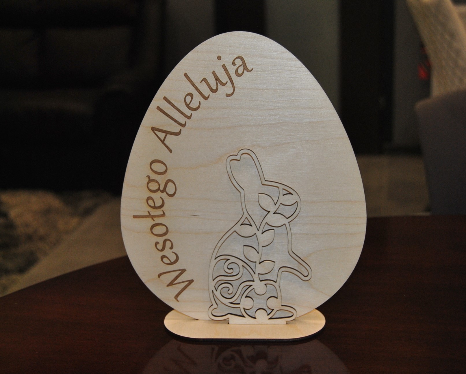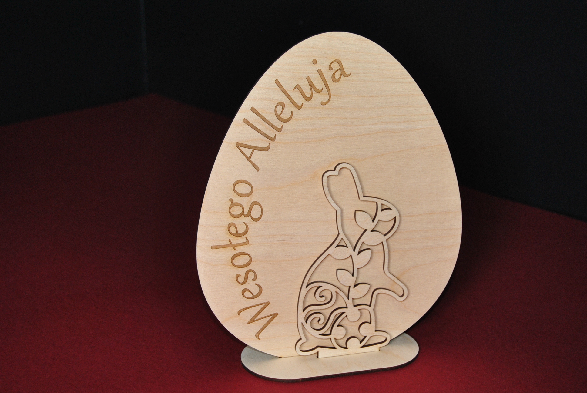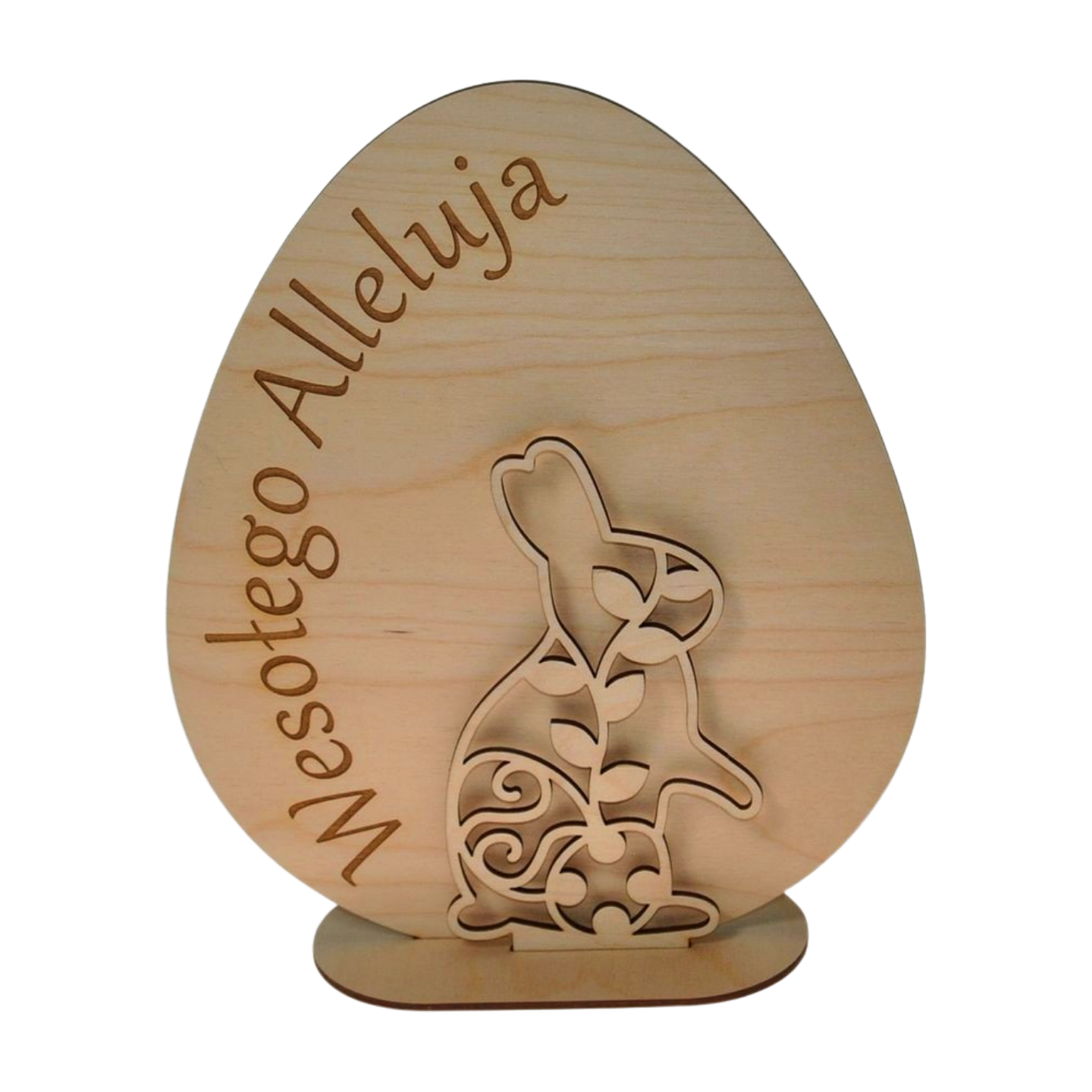 Elegancka i symboliczna ozdoba wielkanocna, która wprowadzi świąteczny nastrój do każdego wnętrza! Stojące jajko wykonane z wysokiej jakości sklejki brzozowej, z wygrawerowanym napisem „Wesołego Alleluja”, a przed nim znajduje się uroczy zajączek, tworzący efekt 3D.