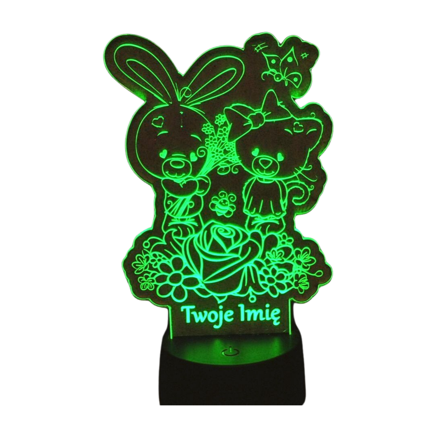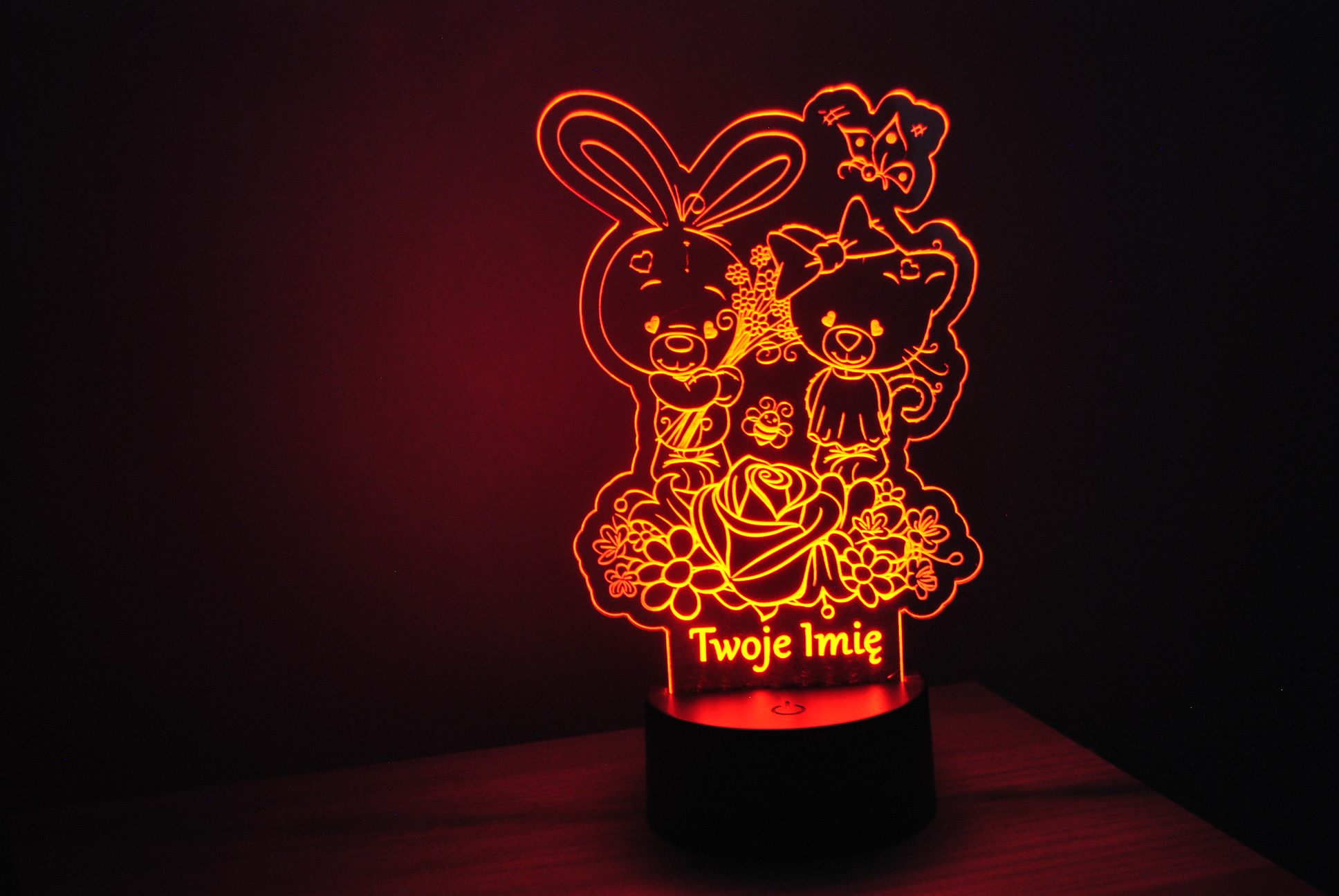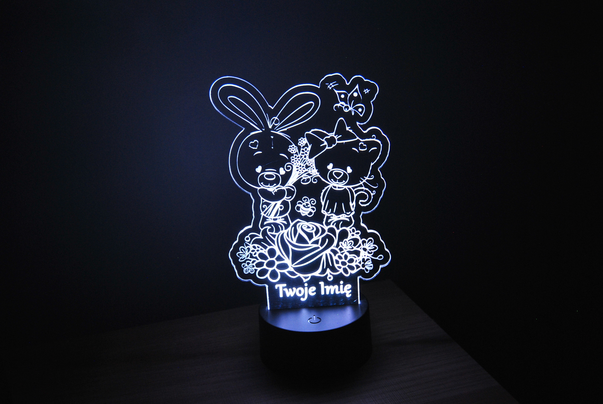 Ta urocza personalizowana lampka LED 3D to idealna dekoracja do pokoju dziecka! 💡 Na lampce znajduje się słodki króliczek trzymający bukiet kwiatów oraz urocza misia. Delikatne światło tworzy przyjemną atmosferę i pomaga zasnąć. Możesz dodać imię dziecka, by lampka stała się wyjątkowym prezentem! 🎁