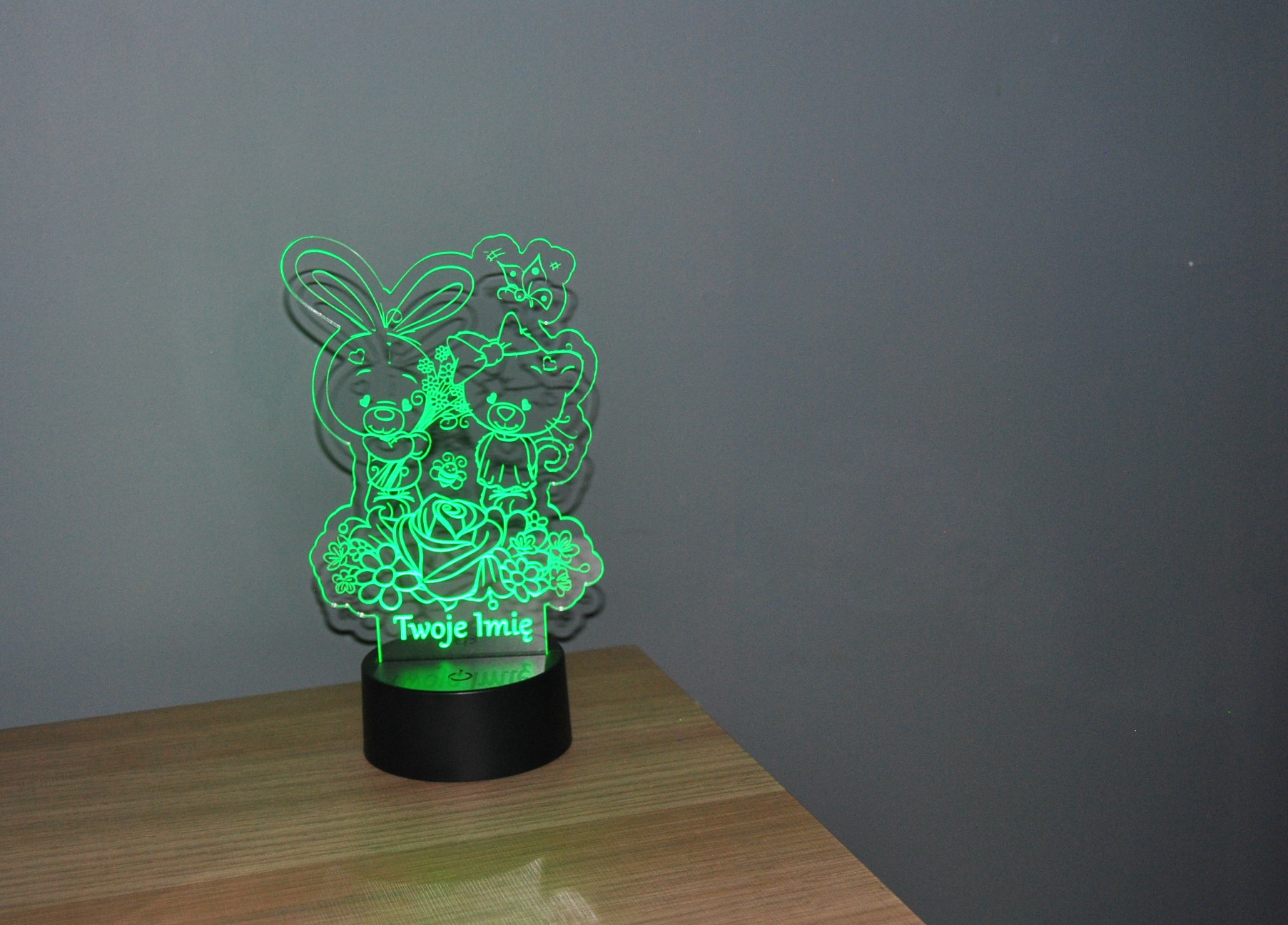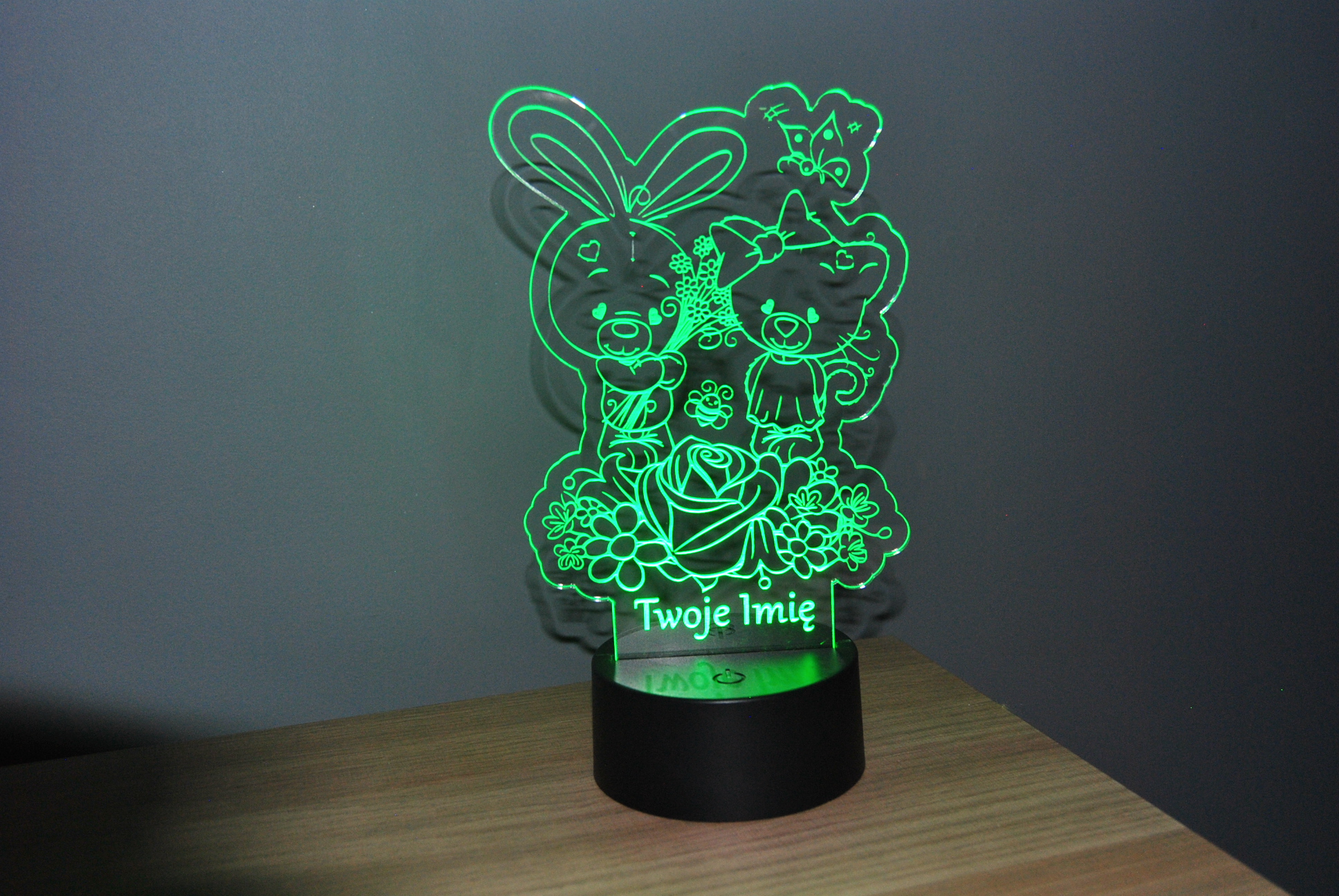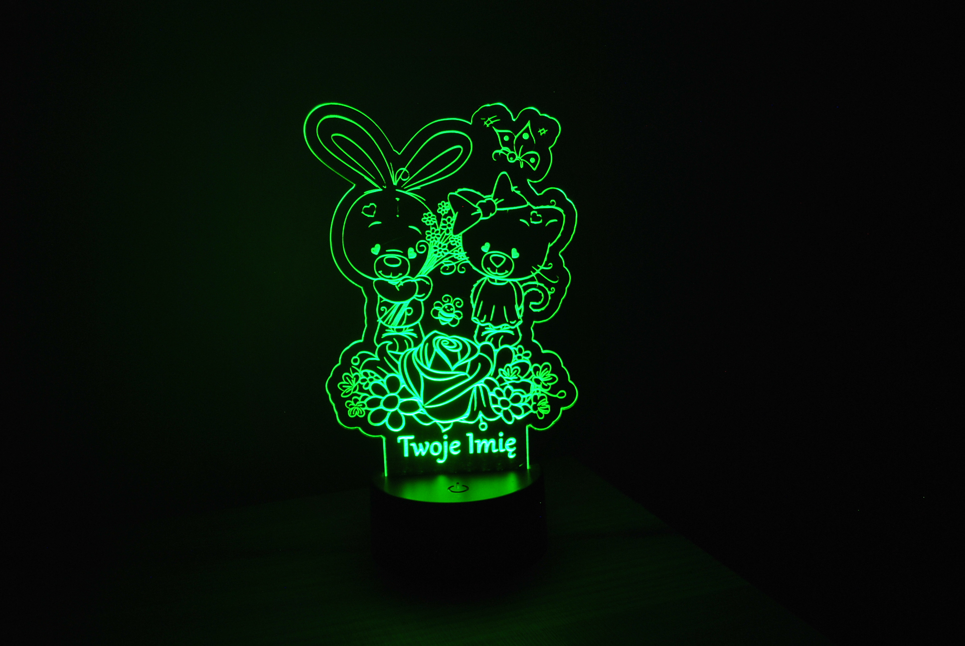 Ta urocza personalizowana lampka LED 3D to idealna dekoracja do pokoju dziecka! 💡 Na lampce znajduje się słodki króliczek trzymający bukiet kwiatów oraz urocza misia. Delikatne światło tworzy przyjemną atmosferę i pomaga zasnąć. Możesz dodać imię dziecka, by lampka stała się wyjątkowym prezentem! 🎁