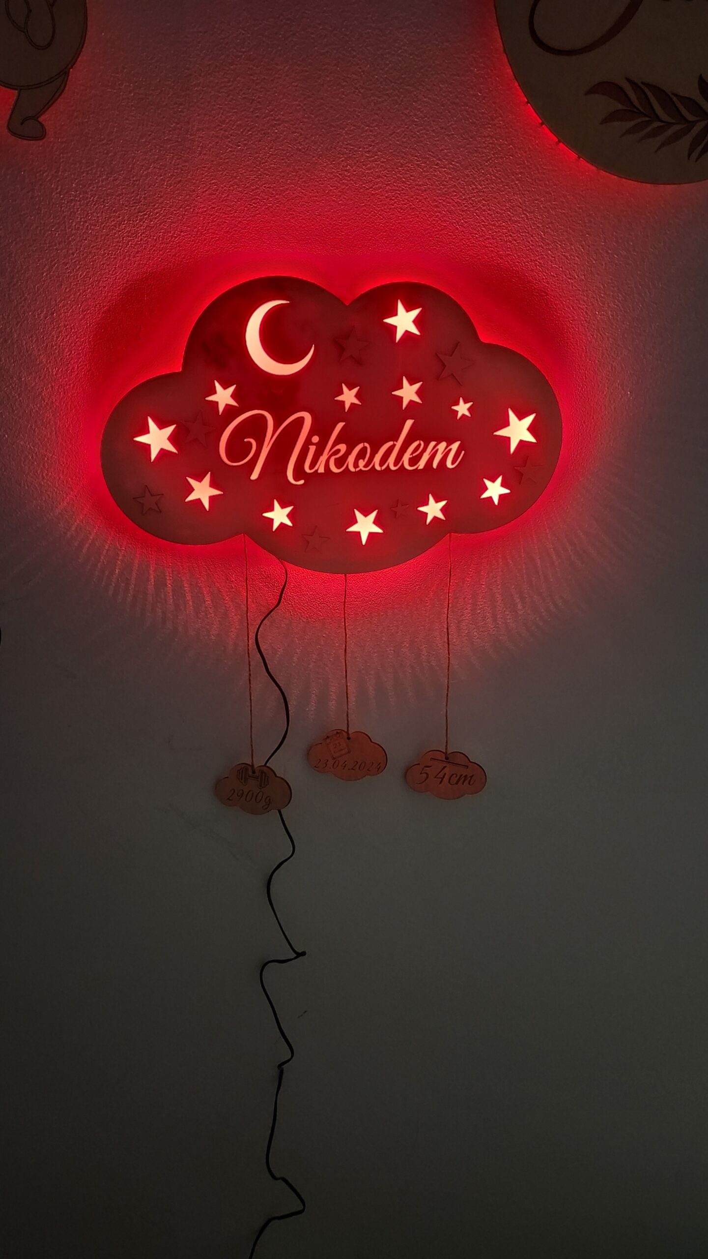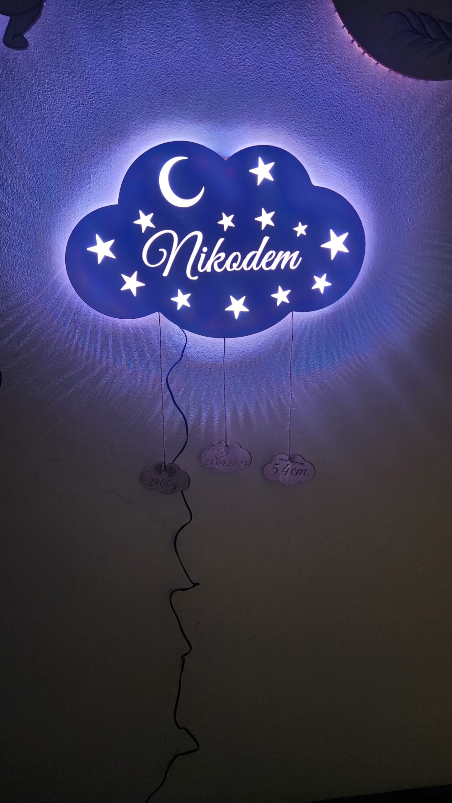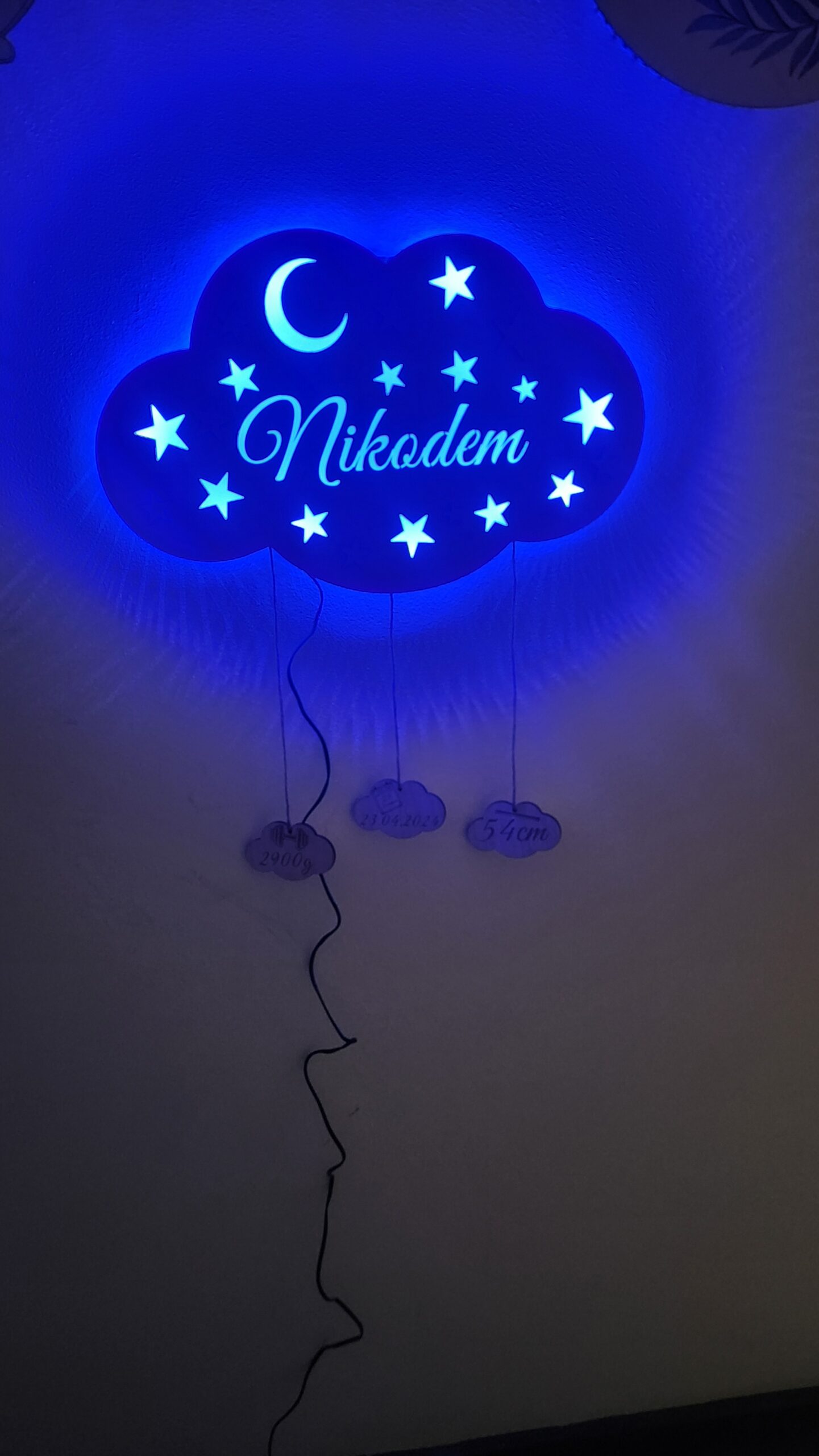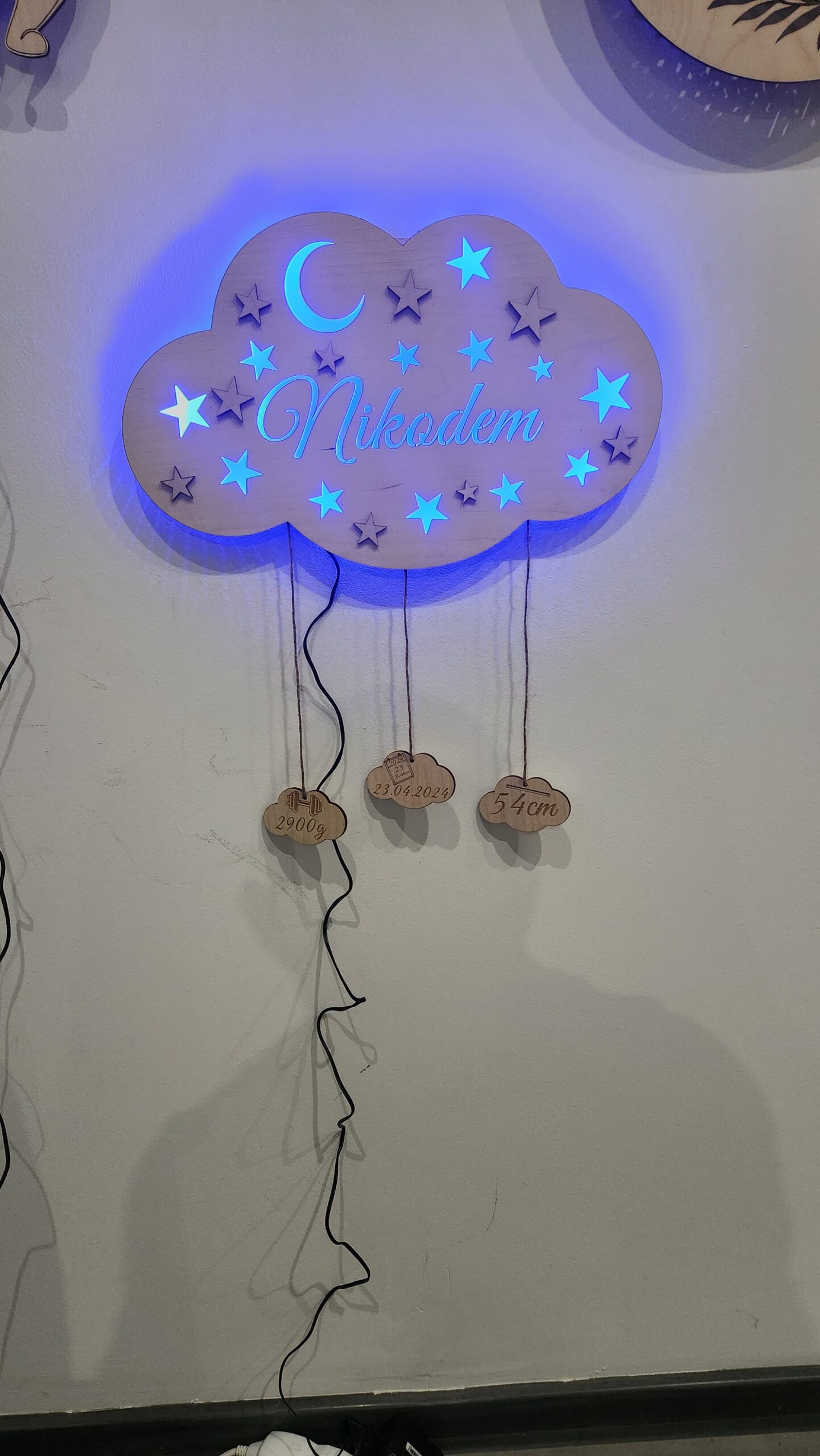 Stwórz wyjątkowy klimat w pokoju swojego dziecka z naszą imienną lampką nocną w kształcie chmurki, która dodatkowo pełni funkcję metryczki. Dzięki zasilaniu LED RGB, lampka zmienia kolory na życzenie, a wygodny pilot pozwala na łatwą obsługę. Wykonana z naturalnej sklejki brzozowej, jest zarówno pięknym, jak i ekologicznym elementem dekoracyjnym.