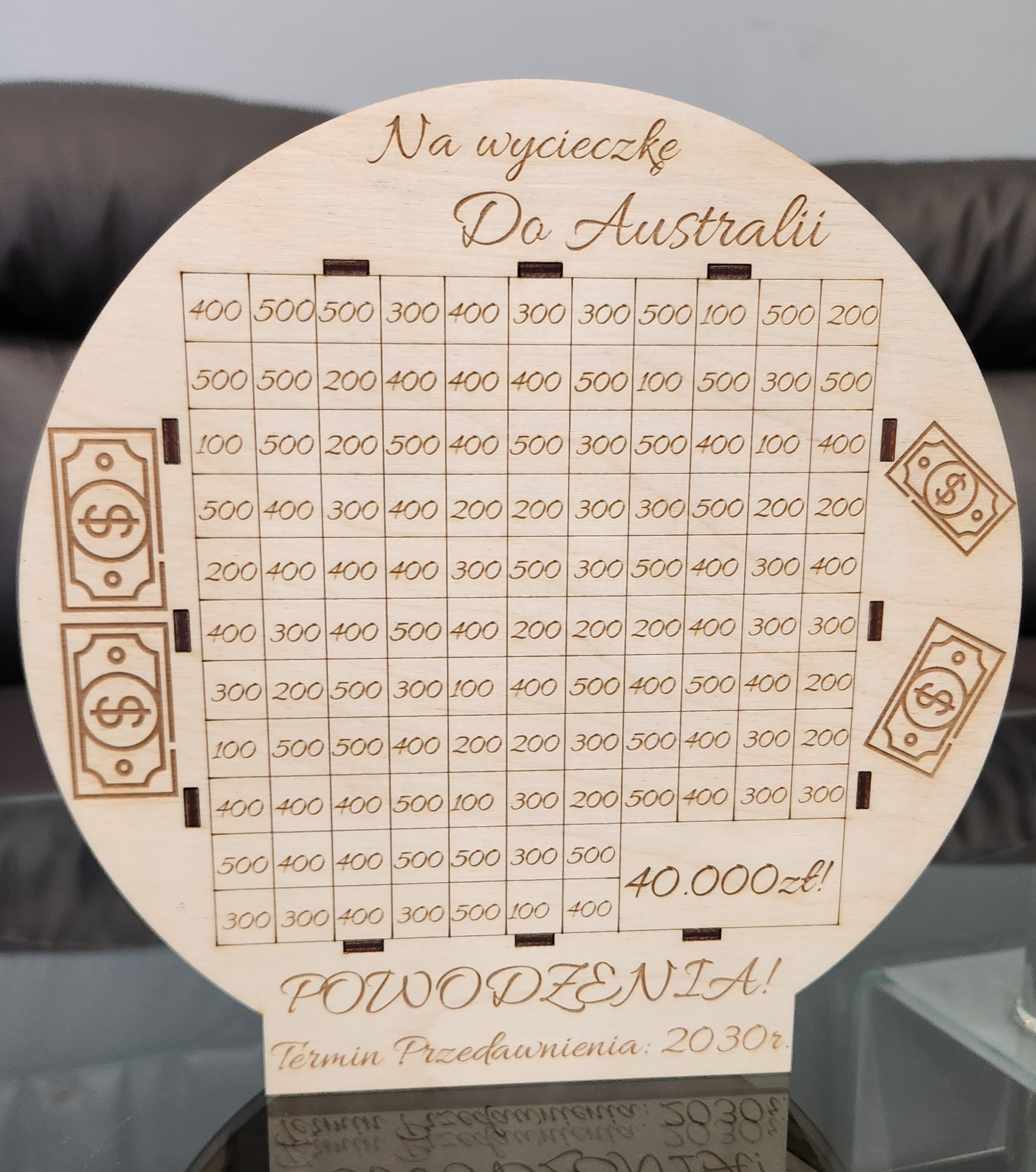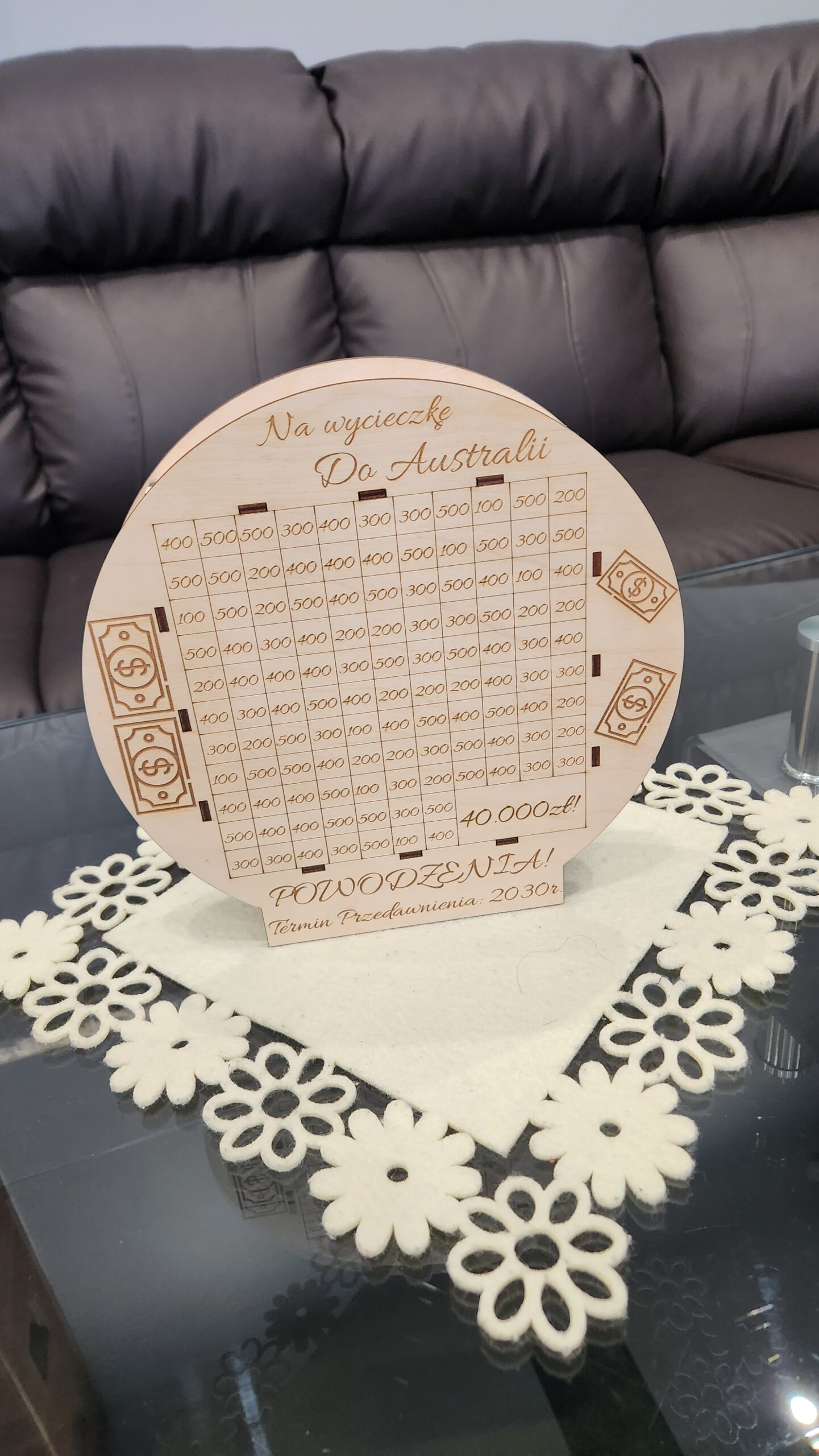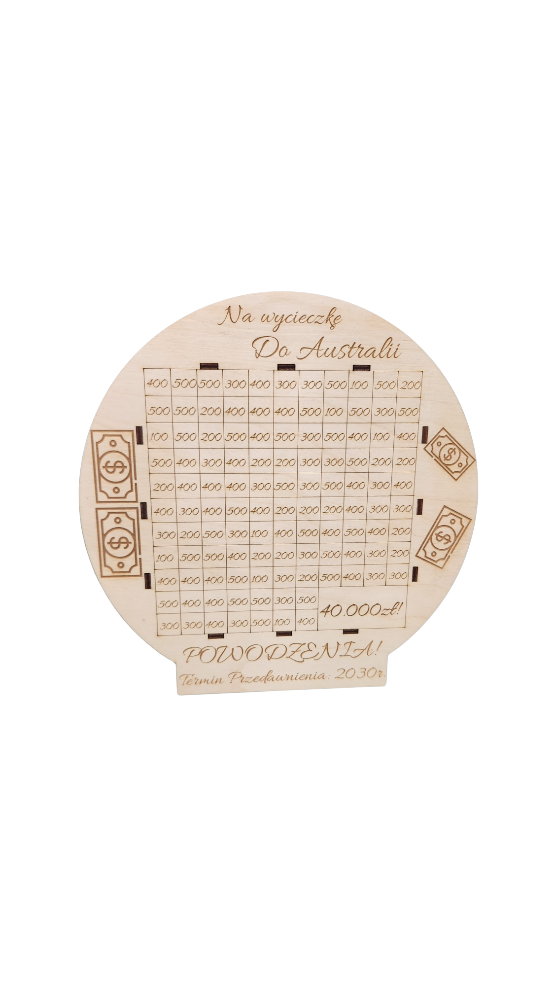 Personalizowana skarbonka okrągła wykonana ze sklejki brzozowej to doskonały sposób na oszczędzanie z przyjemnością. Skarbonka posiada grawerowane kwoty, które można stopniowo skreślać, aż osiągnie się zamierzony cel. Dodatkowo, miejsce na wpisanie kwoty docelowej sprawia, że oszczędzanie staje się bardziej motywujące. Produkt można spersonalizować, dodając imię lub dowolny tekst, co czyni go idealnym prezentem na różne okazje. Naturalny materiał i prosty design sprawiają, że skarbonka doskonale pasuje do każdego wnętrza.